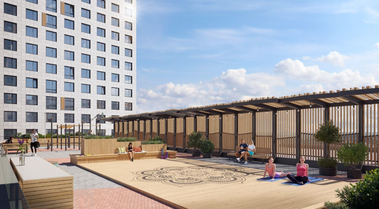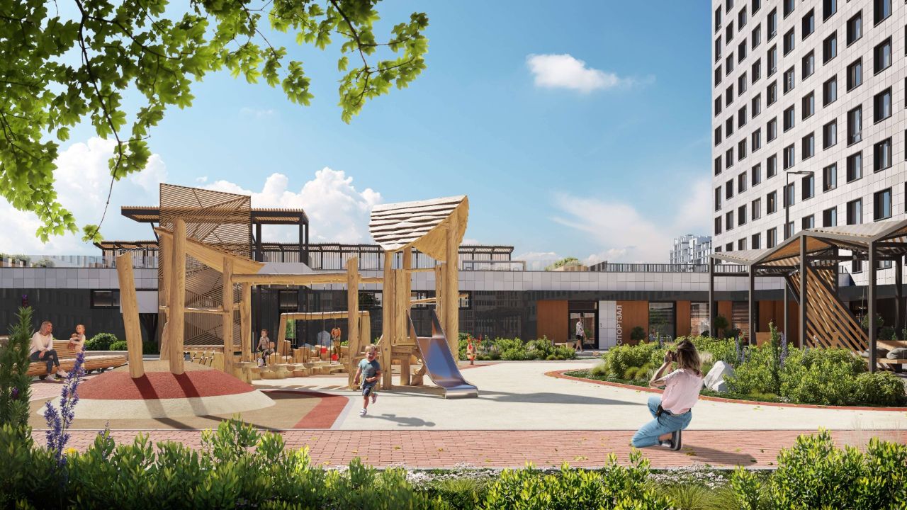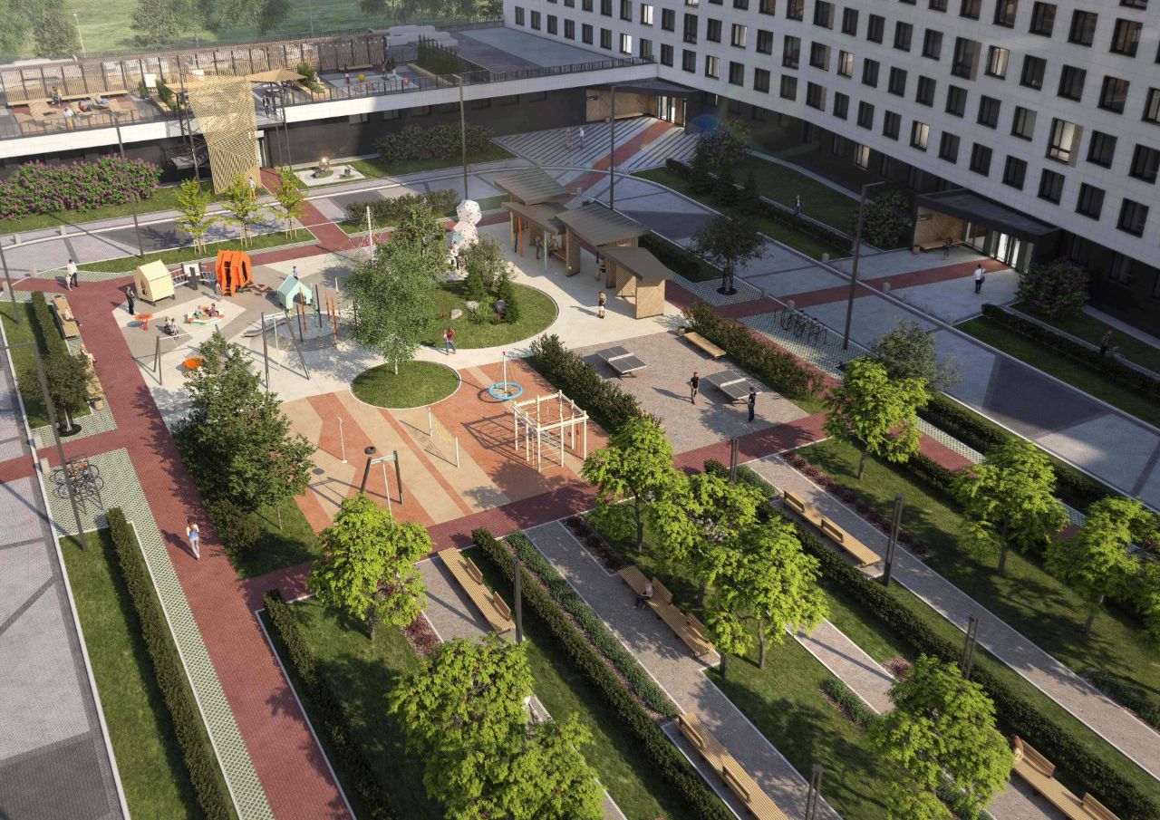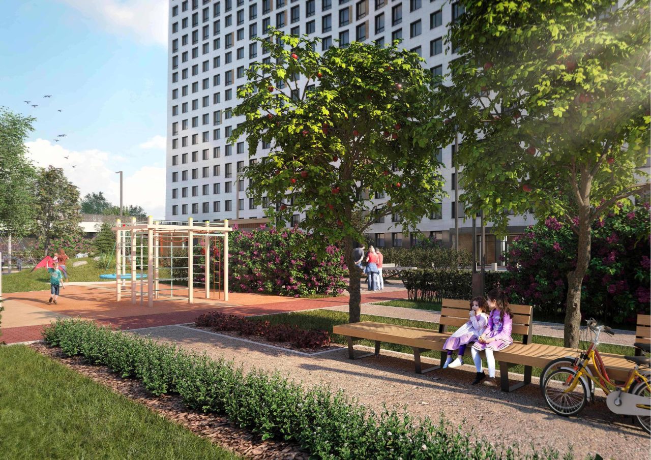 Внутренний двор комплекса доступен только для жителей и оборудован камерами видеонаблюдения. На территории расположены современные детские площадки, яблоневый сад, арт-объекты. Зоны для спорта и отдыха также оборудованы на крыше коммерческих помещений. В домах предусмотрены отдельные кладовые помещения и паркинг на подземном уровне.
